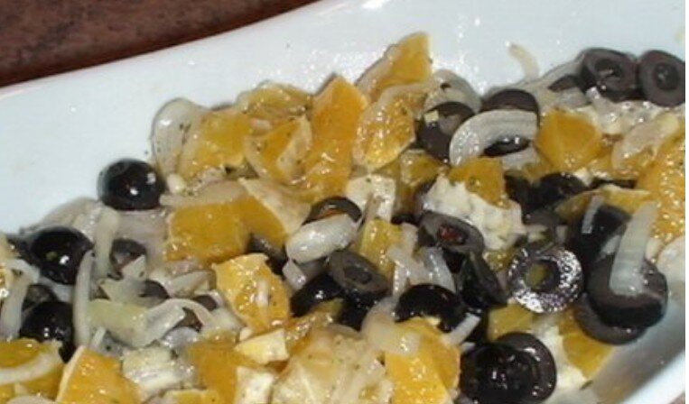 Ингредиенты Апельсин 400 г Лук 1 шт Маслины 10 шт Масло растительное 30 г Перец Соль Апельсины почистить и нарезать на небольшие кубики. Тоже самое проделать и с репчатым луком. Из маслин удалить косточки и порезать их кружками. Апельсины, лук и маслины тщательно перемешиваются между собой, после чего все это заправляется маслом, добавляется соль и перец. Приятного аппетита!