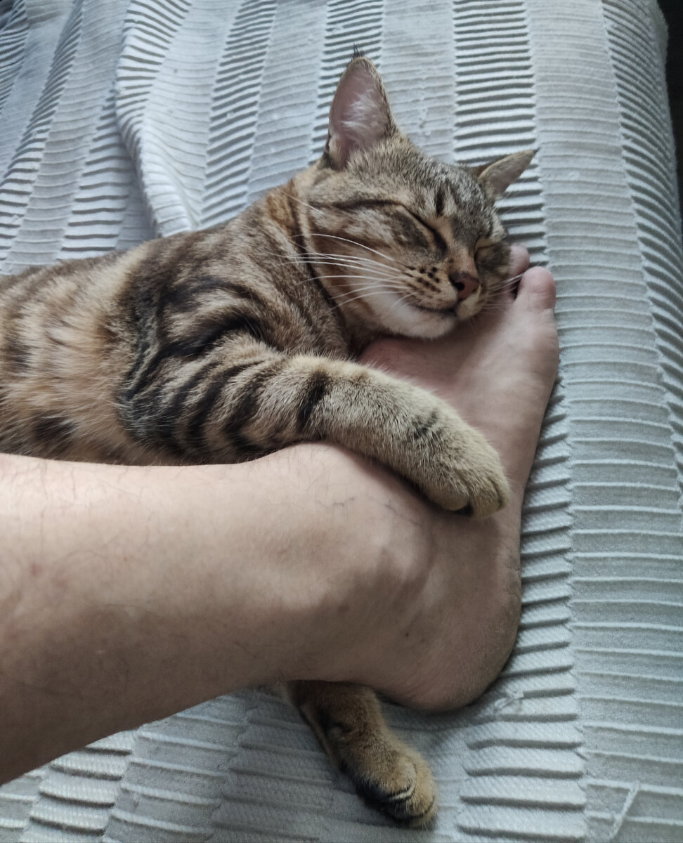 Будусик пришел поздравиться с праздником, обнял с любовью хозяйскую ногу и случайно уснул.