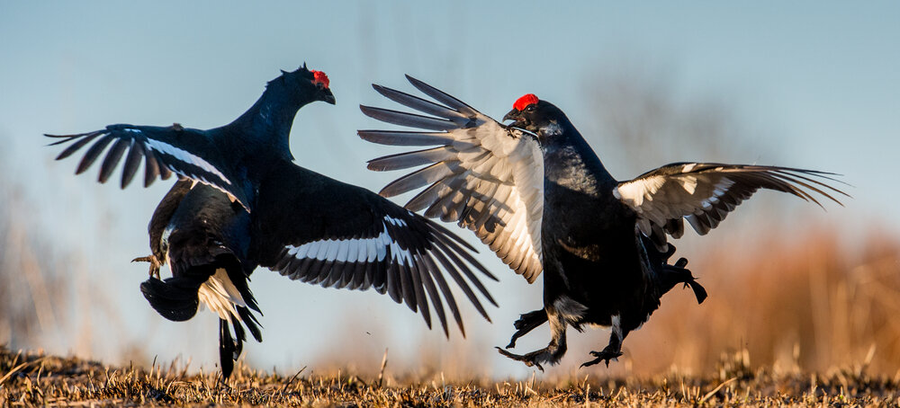 Вышли с напарником на крыльцо избы: уже светло, птичий хор звучит почти в полную силу, несмотря на ощутимый заморозок. И сквозь рулады дроздов, зарянок и пеночек доносилось высокое гулкое неумолчное бормотание, смутно знакомое по книгам писателей-натуралистов! Вдруг бормотание дополнилось резким шипящим звуком: «чуффшши». Сомнения отпали — совсем рядом с заброшенной деревней, где базировался наш экспедиционный отряд, токовали тетерева! Забыв про учетные маршруты, мы азартно ринулись навстречу необычным звукам. Сначала казалось, что ток находится прямо за ближними поскотинами, но пришлось пересечь солидный язык елового леса и взобраться на пригорок, прежде чем на окраине болота мы различили несколько черных точек, хаотично перемещавшихся среди пожухлой, покрытой инеем травы.