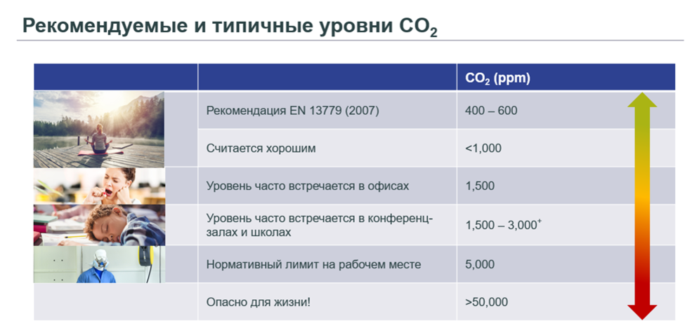 Мы вдыхаем воздух, содержащий 0,03-0,04 % углекислого газа (300-400 ppm [parts per million]) и выдыхаем воздух, содержащий примерно 40 000 ppm (концентрация в 100 раз больше). Если нет хорошей вентиляции в помещении, CO2 быстро накапливается.