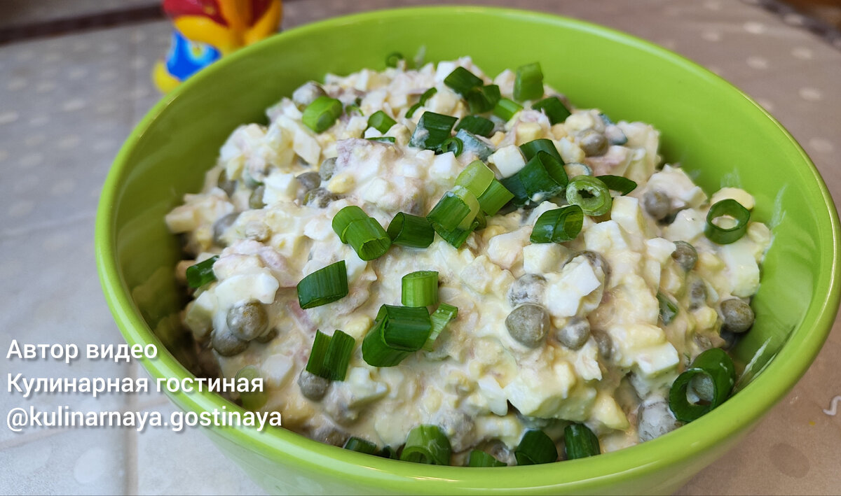🍀Тунец в собственном соку (1 баночка) 185 г. 🍀Яйца 5-6 шт. 🍀Сметана 15-20% или Греческий йогурт 🍀Горошек зелёный 1 банка консерв.горошка (400 гр) 🍀Соль,перец по вкусу и желанию (можно не добавлять) 🍀 Зелёный лук по желанию Отварить и порезать яйца кубиками. Из банки с зелёным горошком вылить жидкость. Лук зелёный мелко порезать. Смешать тунец (можно сок не добавлять, а можно добавить,кто любит.Это по желанию), яйца порезанные, горошек зелёный консервированный, сметану или йогурт греческий, добавить зеленый лук. Всё! Едим и наслаждаемся! Вкусно и полезно! Приятного аппетита 🔥 Готовьте на здоровье 🍀 Какие салаты готовите вы? Пишите, интересно 😉