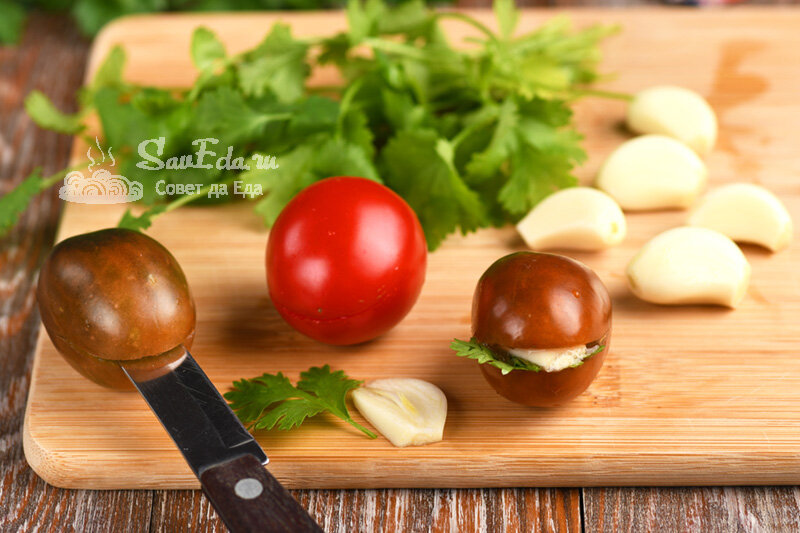 Помидоры с чесноком и зеленью в рассоле суточные (малосольные и очень вкусные)