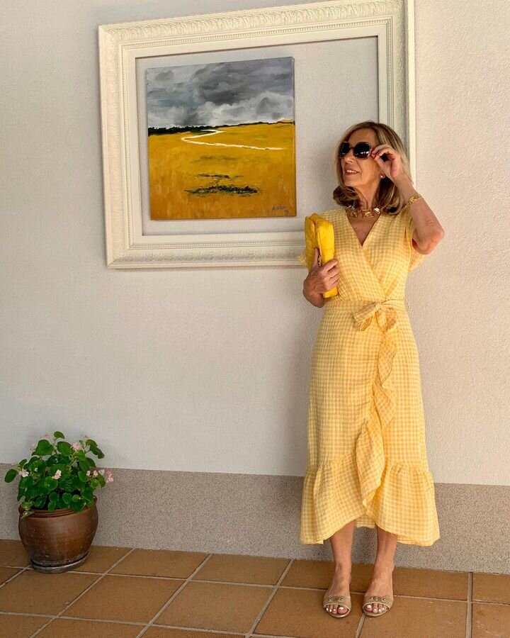 Практически в каждом дамском гардеробе есть платье с запахом. Этот универсальный фасон способен украсить любую фигуру, подчеркнуть хрупкость женского силуэта. Как носить платье с запахом, сегодня вдохновляемся красивыми и стильными образами блогеров 50+. Платья с запахом отлично смотрятся в принтованном исполнении. Стилисты любят добавлять романтические элементы в их крой, например, воланы придают наряду легкости и утонченности. Одежда с плиссировкой визуально делает свою обладательницу выше и стройнее. Чтобы усилить этот эффект, завершите платье сумкой на длинной цепочке и босоножками на высоком, но устойчивом каблуке. Платье с акварельными разводами гарантированно выделит из толпы, сделает образ женственным и запоминающимся. Не все модницы отказываются от обуви на танкетке. В данном случае босоножки отлично вписались в элегантный сет. Август радует нас жаркими днями и теплыми вечерами. Идеальным выбором для такой погоды станет платье с перфорацией. Акцентный аксессуар и крупная бижут
