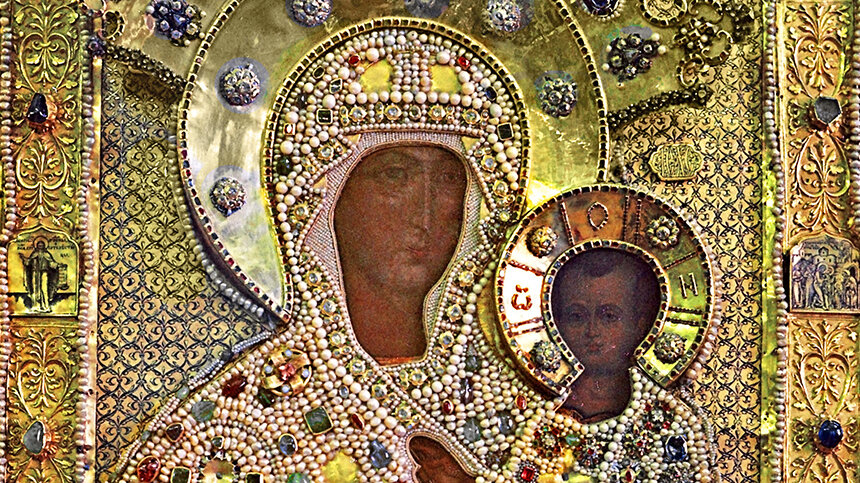 Отдельного внимания заслуживает оклад иконы, декорированный драгоценными камнями.
