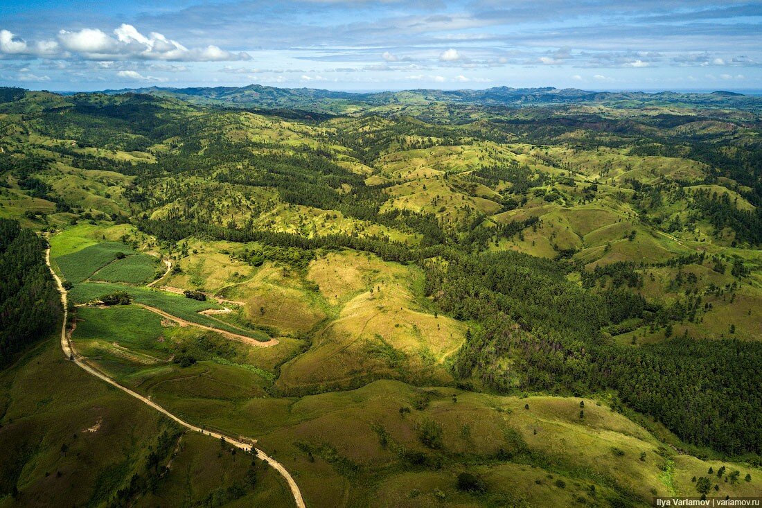 После Фиджи я полетел на Вануату. В Вануату жарко! Жарко везде. Жара начинается в аэропорту и не отпускает тебя, пока ты не сядешь в самолет. Аэропорт старый и без кондиционеров. На потолке висят вентиляторы, но они не справляются. Я взял машину в аренду, но кондиционер в ней еле работал. Я заселился в самый дорогой отель столицы, но в моем номере кондиционер не охлаждал комнату ниже 26 градусов. За сутки на острове жара чуть не свела меня с ума. Но это мне, видимо, не повезло. Не может же в стране не быть ни одного нормального кондиционера? 01. Это Фиджи… что-то напоминает, не правда ли? Мне почему-то природа напоминает либо Альпы, либо Алтай… 02. Еще леса с елочками, прямо как у нас! Что скажете? 03. Повсюду фермы. 04. Я уже вам показал, как живут простые люди, но еще тут есть непростые! В основном это иностранцы, для которых сделали специальные резервации. Местные власти всеми способами стараются привлечь в страну инвестиции, поэтому они не очень дорого продают недвижимость иност