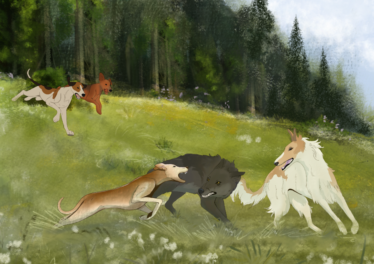 Номер пущен с 25 метров. Пошли плотно и очень резво. Почти сразу вырвалась вперед Медичи , первой приспела и сделала хватку за гачи . Волк отщелкнулся, но в это время с другой стороны на него налетел Барин, сразу взял по месту и завалил. Медичи влепилась в ухо , а Азазель с Закатаем растягивали за задние ноги. Через несколько секунд волк вырвался , закрутился , яростно отбиваясь от наседающих борзых . Азазель, Закатай и Медичи постоянно делали хватки, пытаясь вновь завалить зверя. А Барин,выждав удобный момент, повторил свою попытку и сразу взял по месту , собаки повалили волка и плотно держали. По команде экспертной комиссии волк был принят , а собак отогнали и взяли на поводки.