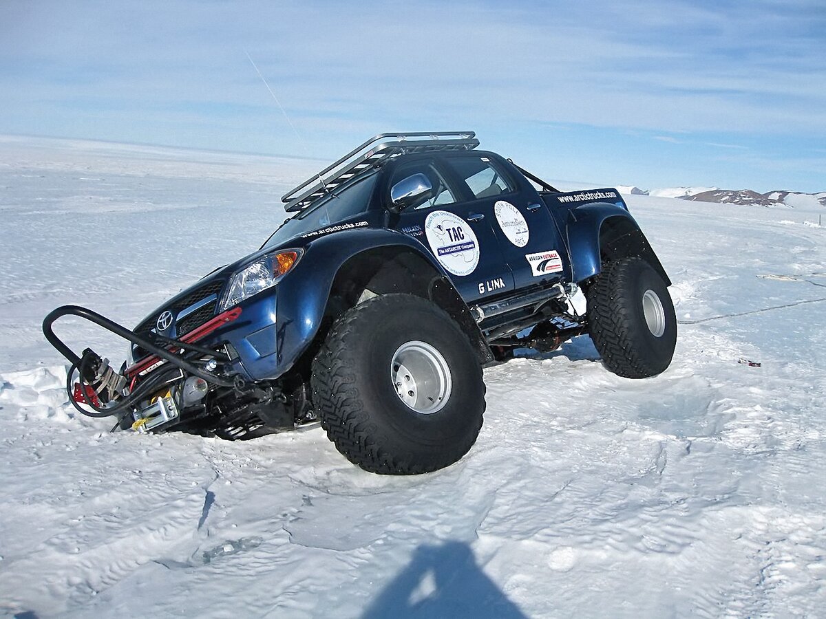 Кроме того, на аэродром станции Новолазаревская привезли из Исландии переоборудованные для полярных условий пикапы на шинах низкого давления «Toyota Hilux». На этих машинах различными экспедициями неоднократно совершались поездки от нашей аэродромной базы до Южного полюса, и занимали они от 5 до 7 дней в одну сторону. А три таких автомобиля приняли участие в беспримерном двойном трансконтинентальном пробеге «Extreme World Races», когда каждый из них прошел по 9500 километров. Это достижение считается рекордом, как самое длинное путешествие на колесном автомобиле по Антарктиде.