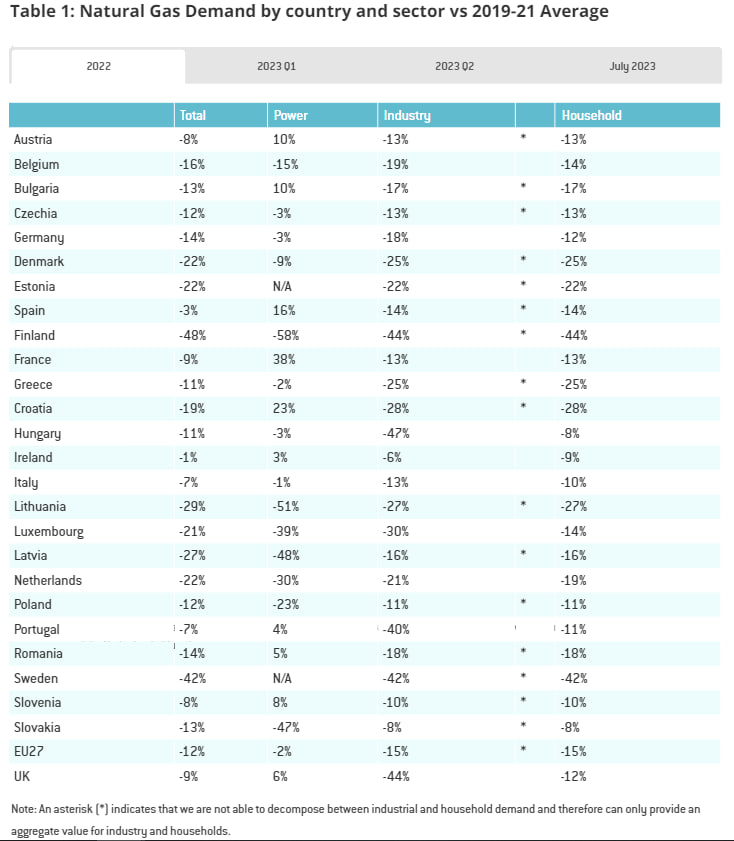 Судя по этим данным, падение спроса саму малость ускорилось. В 2022 году, по оценке Bruegel, потребление газа упало по сравнению со средним показателем за 2019-2021 годы: в Евросоюзе — на 12%, в Великобритании — на 9%.