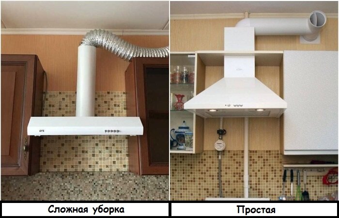 Если не хотите, чтобы пыльная гофр-труба портила вам внешний вид кухни, подумайте о том, чтобы заменить ее на пластиковую систему вентиляции. Ее можно привести в порядок за считанные минуты, просто протерев влажной тряпкой. Еще один вариант избежать появления на кухне крупного пылесборника – установить кухонный гарнитур до потолка и спрятать вентиляционные трубы за дверцами шкафчика.