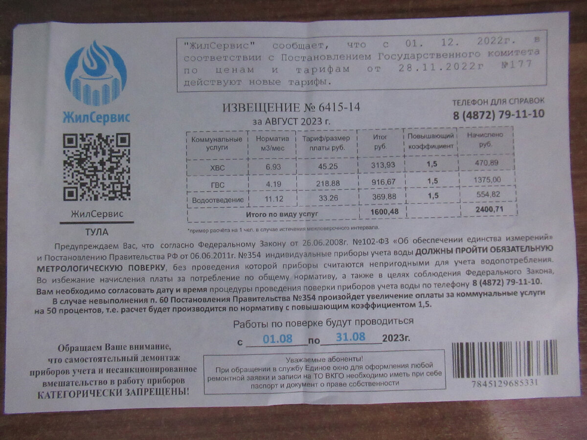 Недавно многие туляки обнаружили в своих почтовых ящиках такие квитанции. Не минула сия чаша и меня. Быстро проверил, что управляющая компания у нас другая. Хотя организация "ЖилСервис" реально существует. Надо сказать, что в квитанции дан "космический" счет за водоснабжение. При этом странным показалось еще то, что квитанция не именная. Собственно основным содержанием квитанции является реклама услуг по поверке водяных счетчиков. Но смутил штрих-код. Неужели мошенничество, кто-то невнимательный или пенсионер какой пойдет и попробует оплатить. Решил проверить сам. Штрих-код оказался не рабочим, ладно хоть тут явно не "развод" доверчивых и невнимательных клиентов на деньги. В общем банальная реклама услуги, но есть тут и доля лукавства. В тексте сказано, что согласно закону такому-то, постановлению такому-то приборы учета воды ДОЛЖНЫ ПРОЙТИ ОБЯЗАТЕЛЬНО МЕТРОЛОГИЧЕСКУЮ ПОВЕРКУ и дан срок проведения этих работ. И здесь может показаться, что в квитанции написано о том, что всем, кто им