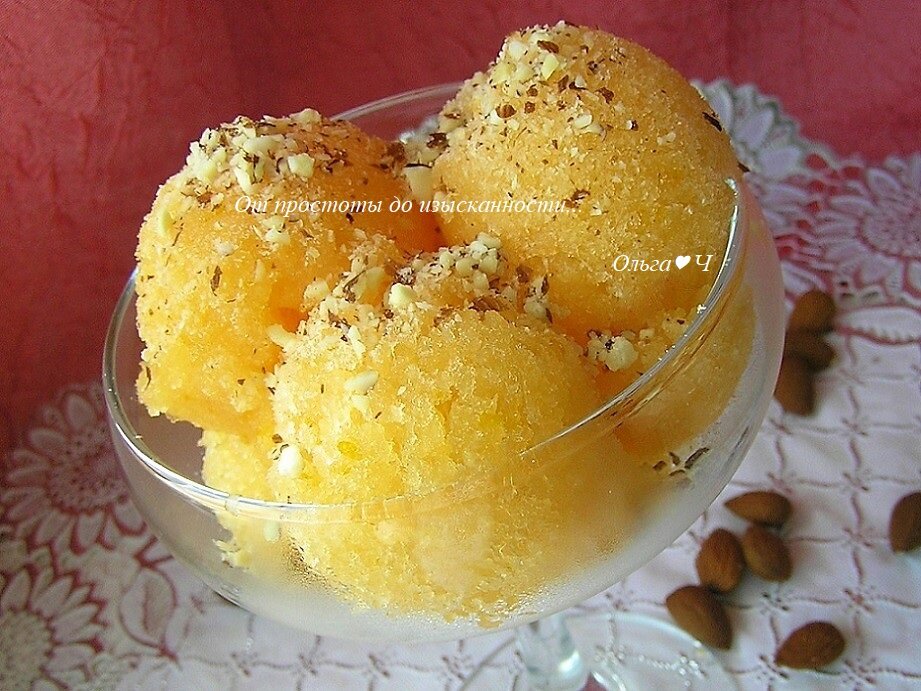 обжаренный миндаль для подачи Приготовление: Снимите цедру апельсина, выжмите апельсиновый сок, смешайте с соком лимона. Дыню разрежьте пополам, удалите косточки, выньте мякоть с помощью столовой ложки. Мякоть дыни выложите в чашу блендера, добавьте сахарную пудру, цедру апельсина и сок. Измельчите до однородности. Выложите массу в контейнер и уберите в морозилку. Примерно через каждые 40-60 минут доставайте контейнер и тщательно перемешивайте массу. Через 5-6 часов сорбе будет готово! За 20-30 минут до подачи выньте сорбе из морозилки, с помощью специальной ложки сделайте шарики, заполните креманки, посыпьте измельченным миндалем. Приятного аппетита!