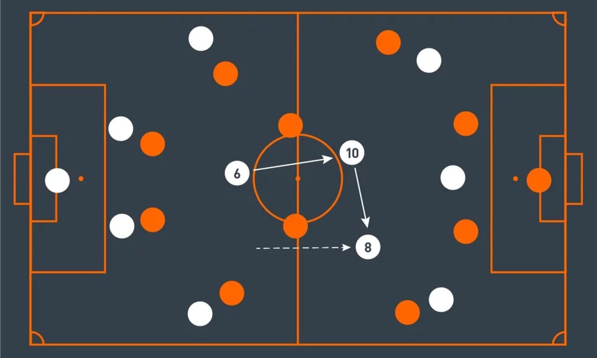 Найти такого игрока можно разными способами. Один из них связан с расстановкой в периоды владения мячом, когда футболисты располагаются на разной высоте и почти не задерживаются на одной линии, создавая более выгодные ситуации для передач. Использование всей ширины поля также важно для того, чтобы растянуть структуру соперника.