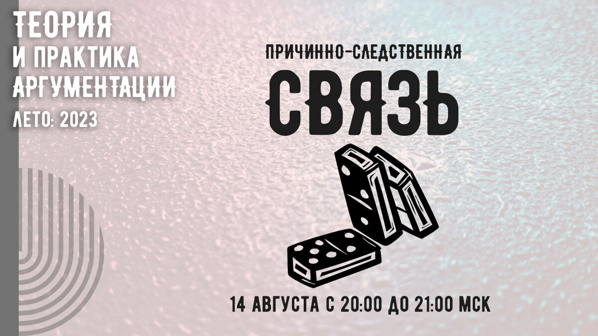 14 августа с 20:00 до 21:00 мск в рамках курса "Теория и практика аргументации 2023: лето (бронежилет для русского аргумента)", состоится второе занятие. 1. Понятие причинно-следственной связи. 2. Виды причинно-следственной связи. 3. Нарушения причинно-следственной связи. https://youtube.com/live/PBQne35W5Y4?feature=share