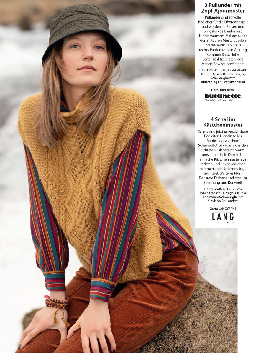 Добрый день дорогие рукодельницы! В новом журнале Verena много красивых изделий на осень, все модели номера со схемами вы можете посмотреть на моем сайте или по ссылке. Первая модель жилета-свитера с ажурным узором косы. Жилет является стильным компаньоном для переходного периода, их носят с блузами, тонкими водолазками. Модель представлена в теплом кукурузно-желтом цвете с рельефной полосой по центру и высокими боковыми разрезами, которые обеспечивают свободу движений. Носите жилет в сочетании с тонкой водолазкой в нейтральном цвете под ним. Добавьте стильную юбку в цвете, гармонирующем с жилетом. Этот образ подчеркнет вашу женственность и придаст образу легкой элегантности. Комбинируйте жилет с блузой в контрастном или нейтральном оттенке. Добавьте классические брюки со стрелками и завершите образ обувью на небольшом каблуке. Это стильный вариант для офисного образа. Размер: 38/40 (42/44) 46/48 Материал: BUTTINETTE Woll Butt Primo Alpaka" (70% альпака, 30% полиамид, 125 м/50 г), 35