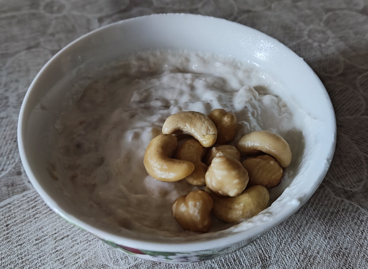 Как же так скажите вы!? А из чего готовить то будем? Конечно "ничего нет" очень громко сказано, но и правда этот десерт состоит лишь из трёх ингредиентов и готовится за 5 мин. Итак, нам понадобится на 1 порцию: - один большой банан - 125 г мягкого творога или можно взять греческий творог - 10-15 г любых орехов (у меня арахис и кешью) Для начала разламывая банан кладём его в какую-нибудь чашу. Далее превращаем в пюре с помощью вилки, нужно сказать, что банан должен быть спелый или переспелый, чтобы его было удобно переменать. Теперь к банану добавляем творог и тщательно перемешиваем до однородной консистенции. Теперь добавляем орехи и наслаждаемся красотой и вкусом нашего рецепта.