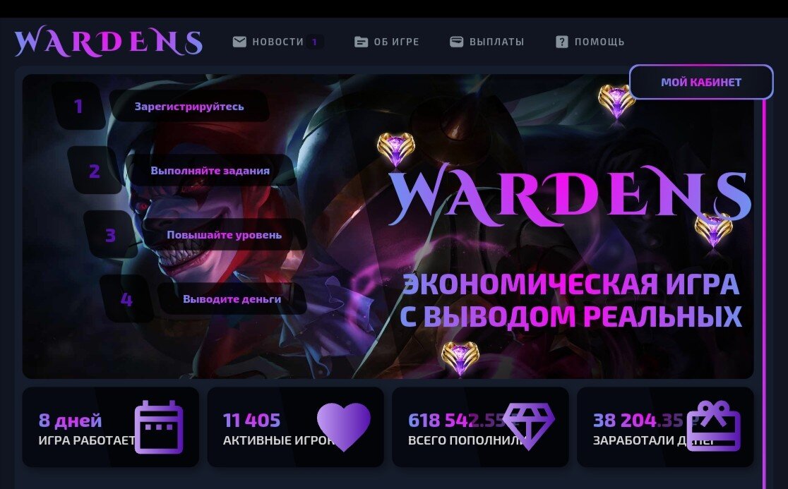 UPD: Выплаты ограничены, не заходить (см. Следующую статью по игре) Приветствую дорогой читатель! Поговорим сегодня о достаточно противоречивом проекте WARDENS. На 09.08.2023 проекту 8 дней. Если бы у меня спросили насколько это рисковый проект по десятибалльной шкале, я бы сказал 10/10💀. Экономики как таковой и нет. Проект может закрыться через час, день, месяц. Коротко об игре После регистрации вам предоставлять бесплатного героя (конечно же на нем вы ничего не заработаете😁). Суть игры в покупке героев который майнят вам 💰. Героям можно прокачивать скиллы за некие кристаллы (добываются по нажатию кнопки в подземельях/башнях). Путем прокачки героев увеличивается и скорость заработка. Героев не много, чем он дороже тем больше приносит естественно. Про заработок Сразу скажу деньги выводятся, проверял (можно вывести даже 1р). Я в проект зашел и положил 3💲(ибо бомж). С учетом бонуса пополнения и выполненных квестов при покупке героев (дают немного денег при выполнении) мне хватило на