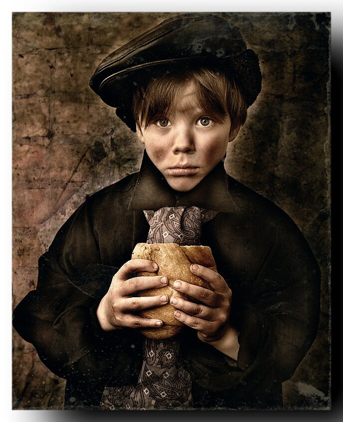 Мальчик сидел перед столом, и его ввалившиеся глаза приросли к коржам. Он ждал, когда ж его угостят, и вдыхал в себя теплый дух испеченного хлеба. Он едва сдерживался, чтобы не протянуть руку и не взять без спроса завидное угощение. Наконец бабушка подошла к нему и сказала: