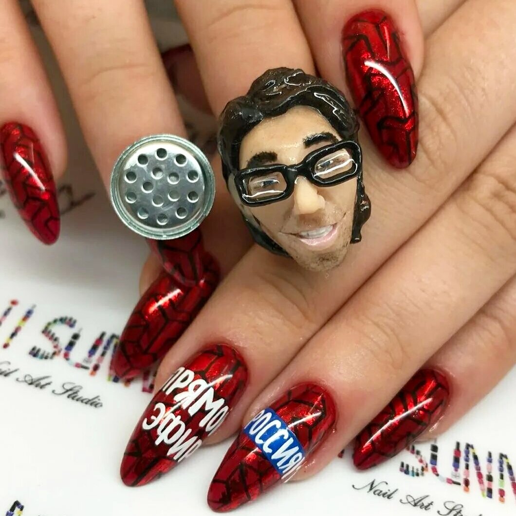 Даже считать страшно, сколько лет я делаю сама себе маникюр... А ведь прошло уже примерно 18 годков с тех времен! К мастерам я тоже ходила, хоть и не так часто, как могла бы. А всему виной мой страх подхватить какую-нибудь инфекцию. Но сегодня не об этом... Эх... Многое я упускаю в своей жизни. Ведь сейчас можно выдать такой запрос мастеру, что окружающие просто обалдеют и не поверят глазам своим, увидев нереальную "красоту" на чужих пальчиках! Сразу оговорюсь, что работы не мои. Но очень привлекли мое внимание. Например, вот такой маникюр. Так-так, кто это у нас тут, Малахов? Похооож! Ну, а чего удивляться? У всех известных личностей есть свои поклонники. Может, и у меня когда-нибудь будут 😳 А вот дальше я что-то не совсем поняла, из чего сделаны ноготочки. Сложилось впечатление, будто это реальные тампончики, которые решили просто приклеить на пальцы. Ну а что, удобно. В сумке искать не придется. Все под рукой! Точнее, все на руках. А сюда, похоже, прилепили фигурки со свадебного то