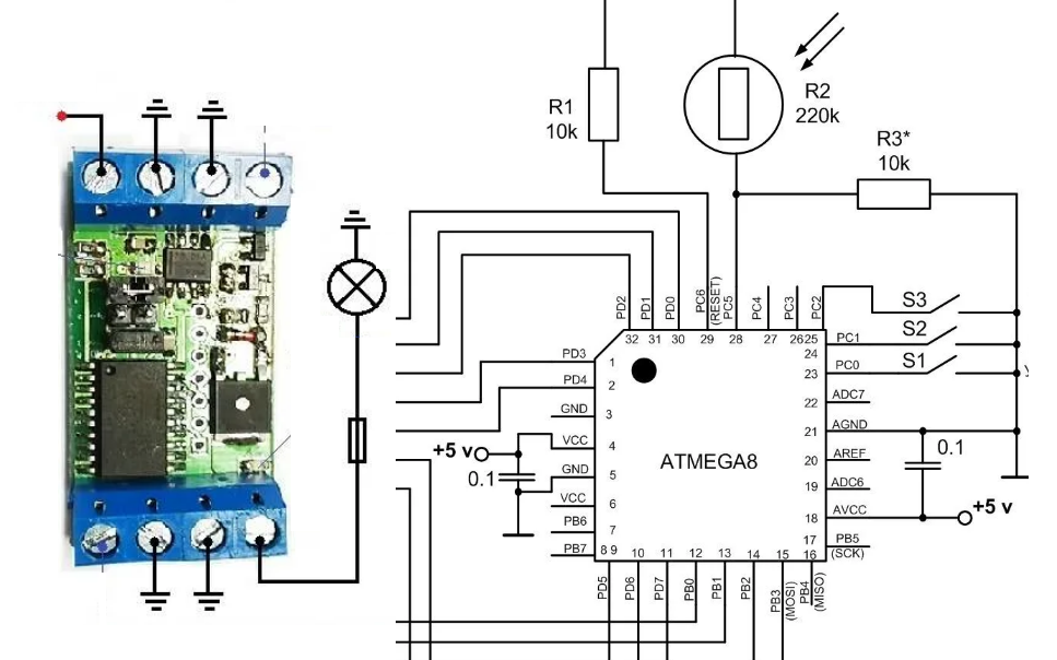 Вот с одной из таких схем я вас сегодня и познакомлю. ЧТО !? РЕАЛЬНО НА МИКРОКОНТРОЛЛЕРЕ ? Оказывается ДА именно эта схема требует не только настройки но и программирования! Программа для микроконтроллера написана в бесплатной программе MikroБ Пro. Загрузить версию MikroБ Пro 6.6.3 можно по адресу <https://download. mikroБ.там/setups/compilers/v666. zip>. Что-же это за устройство такое, что для его работы нужна программа? В устройстве применено импортное реле TRV-24VDC-SC-CD с номинальным напряжением 24 В и сопротивлением катушки 1280 Ом, его можно заменить аналогичным реле серии TRJ. Фоторезистор - серии VT9xx или GL55xx . Постоянные резисторы - МЛТ, С2-23, подстроечный резистор - многооборотный серии 3296. Импортный транзистор 2SC1815 можно заменить транзистором серии КТ315 с допустимым напряжением коллектор-эмиттер не менее 25 В. Стабилитрон VD3 должен быть с н