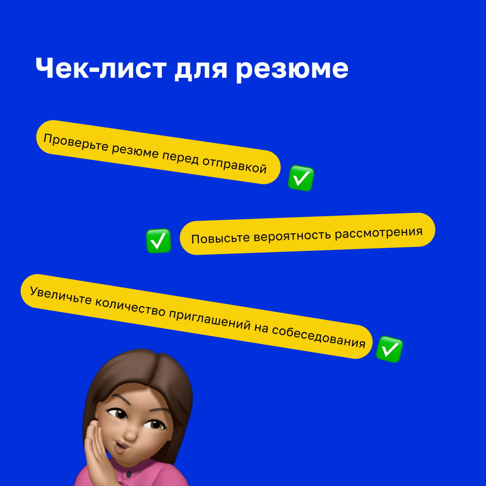 Небольшой чек-лист для проверки вашего резюме👇🏼 ✅Проверьте, что позиция в вашем резюме соответствует позиции, указанной в вакансии. ✅ Проверьте, соответствует ли указанный опыт работы и достижения тому, что требуется в вакансии. Самое важное и релевантное выносите вперед, делайте на этом акцент. ✅ Исключите лишнюю информацию из резюме. Например, опыт работы, неподходящий для этой позиции. ✅ Дополните резюме ключевыми словами из вакансии — еще раз внимательно прочитайте описание и посмотрите, насколько ваше резюме подходит под то, что ищут. ✅ Обязательно проверьте орфографию и пунктуацию, оформление. ✅ Проверьте уместность фото. Не используйте селфи, фото в купальнике и тому подобные 😅 Есть еще много мелочей, но перечисленные пункты уже помогут избежать критичных ошибок 🤓 Подписывайтесь на мой телеграмм-канал, там еще больше полезных советов!