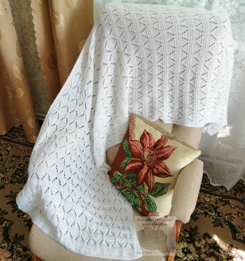 Добрый день, друзья! Лето в разгаре, но пора подумать и о прохладных днях. Представляю новую работу - палантин "Ажурная геометрия". Палантин связан из пряжи Alize белого цвета. Эта пряжа входит в число моих "теплых" любимчиков. Теплая, нежная, не колется. Пряжа - Alize Angora Real 40 Метраж - 430 м в 100 г Состав - 40% шерсть, 60% акрил Цвет - 55 (белый) Узор выбрала не сложный, вяжется легко, запоминается быстро Посмотрим на него поближе. Схема узора Схему составила в программе вязаный.РФ Раппорт узора состоих из 10 петель и 24 рядов. На схеме указаны и лицевые и изнаночные ряды. На схеме петли обозначены так, как они выглядят с лицевой стороны. Будьте внимательны при обратно-поворотном вязании Описание работы Размер палантина: длина - 180 см, ширина - 56 см, вес - 220 г. На спицы 4 мм набрала 122 петли и провязала 8 рядов платочной вязкой. Край вязала с двойной кромочной петлей. Потом узор распределила так: 2-я кромочная, 4 петли планки платочной вязкой, 110 петель основного узора (