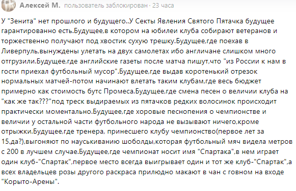 Здесь нам не нравится не то, что ругают "Спартак" - мы и сами ругаем, непременно за дело. В этом комментарии плоха в первую очередь чрезмерность - Секта Явления Святого Пятачка. Есть уже Секта Свидетелей Спартака - устоявшееся выражение. Не надо дополнительно подкалывать там, где уже всё подколото. Во-вторых, не нравится верхоглядство и неконкретность. Где про бромантан? Где безумная гребчиха? Где Лариса Нечаева? Где про Унаи Эмери и Федотова? Где цитаты из письма драматурга Зорина (не родственник) в газету "Советский Спорт"? Где, в конце концов, про Ловчева и мохер?