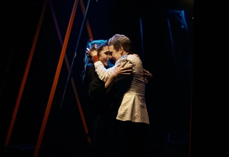 Но зря зритель ждет поезда, его не будет. Режиссер предлагает иной образ - из железных рельсов он «выковывает» качели. Сцена страсти между Вронским и Анной разыгрывается на качелях, между ними, как между лезвиями ножей, проходит героиня в последней сцене, перед гибелью. От качелей захватывает дух, радостно и страшно лететь под облака и срываться в бездну. Но бездны мы не увидим, а услышим в финале спектакля голоса актеров, рассуждающих о сути, смысле и силе любви, торжествующей над смертью.