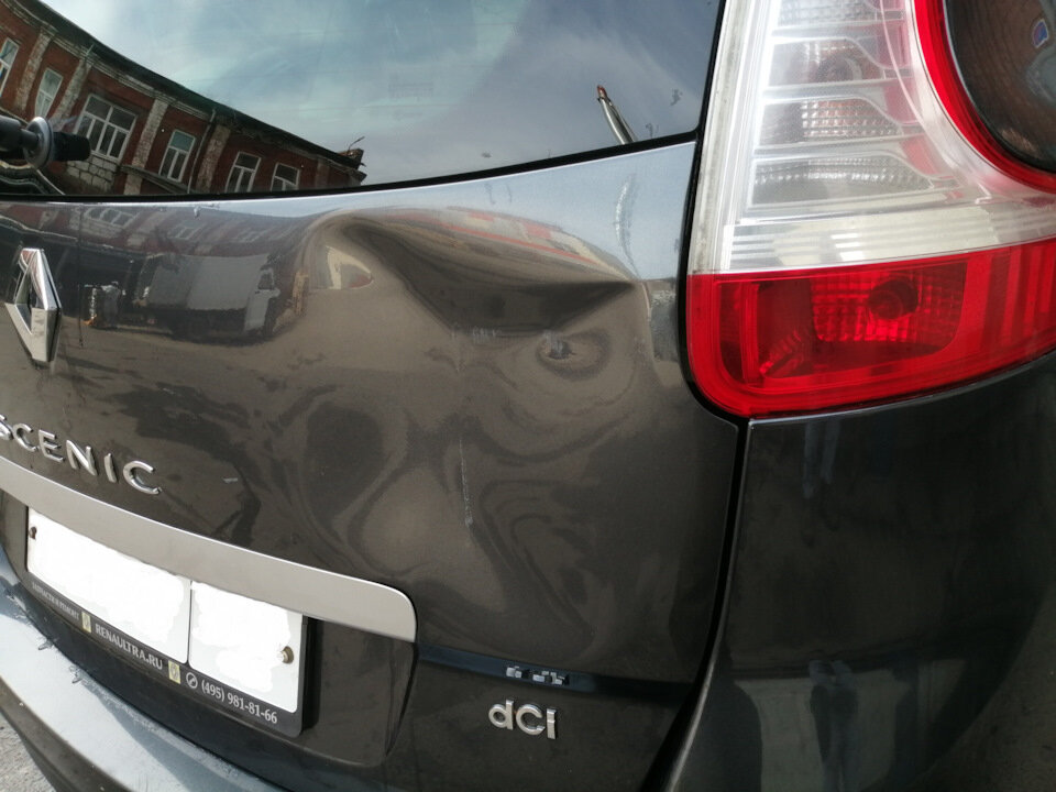 Багажник помят в результате упора в неподвижное препятствие при парковке. Для ремонта с сохранением краски снимаем обшивку. Результат 5 часов работы на фото. На все вопросы по ремонту с удовольствием ответим по телефону:
