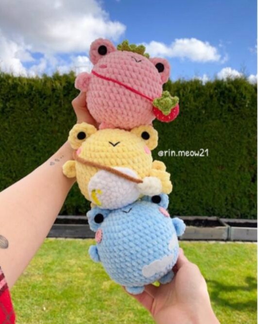 Материалы Тело 1р. 8сбн в КА 2р. 8пр - 16 3р. (сбн, пр)*8 - 24 4р. (3сбн, пр)*6 - 30 5р. (4сбн, пр)*6 - 36 6р. (5сбн, пр)*6 - 42 7-14р. 42сбн 15р. (5сбн, уб)*6 - 36 16р. (4сбн, уб)*6 - 30 17р. (3сбн, уб)*6 - 24 18р. (2сбн, уб)*6 - 18 19р. (сбн, уб)*6 - 12 20р. 6уб - 6 Закрепить и обрезать нить. Вышить рот на 5-6 рядах. Румяна Drops Safran/Worsted 1р. 6сбн в КА 2р. 6пр - 12 Или просто вышейте Глаза 1р. 6сбн в КА 2р. 6пр - 12 3р. 12сбн Закрепить и обрезать нить, оставив хвост для пришивания. Пришейте глаза между 4-7 рядами. Можно вставить безопасные глазки или приклеить шерстяной фетр. Руки и ноги 1р. 7сбн в КА сильно не стягивайте, чтоб получилась дуга. Закрепить и обрезать нить, оставив хвост для пришивания. Пришейте руки между 10-11рядами. Ножки пришиваем вниз туловища. Живот Белый цвет 1р. 6сбн в КА 2р. 6пр - 12 3р. (сбн, пр)*6 - 18 4р. (2сбн, пр)*6 - 24 5р. (3сбн, пр)*6 - 30 6р. (4сбн, пр)*6 - 36 Закрепить и обрезать нить, оставив хвост для пришивания Шапочка с клубничным