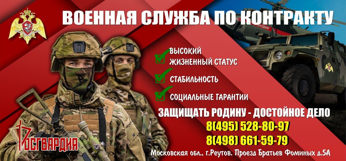 Главное управление Росгвардии по Московской области проводит набор граждан для прохождения военной службы по контракту в новых регионах Российской Федерации. По вопросам поступления на военную службу необходимо обращаться по адресу: Московская область, г.Реутов, проезд Братьев Фоминых д.5А, (Главное управление Росгвардии по Московской области). Контактные телефоны: 8(495) 528-80-97, 8 (498) 661-59-79. Требования к кандидатам: - мужчины в возрасте от 18 до 45 лет, отслужившие военную службу по призыву или контракту, годные к военной службе по состоянию здоровья (имеющие дефицитные специальности в отдельном порядке); Денежное довольствие военнослужащих по контракту: • 195 тыс. руб. единовременно (при заключении первого контракта на срок от года и более); • от 200 тыс. руб. в месяц (в зависимости от воинского звания, должности и выслуги лет); • ежегодная материальная помощь в размере 1 оклада денежного содержания; • единовременные выплаты и ежемесячные надбавки за награждение государствен
