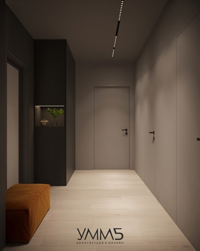 Входная часть квартиры достаточно просторна, это холл, из которого далее можно попасть во все остальные помещения. Прихожая выполнена в нежных пастельных тонах с акцентной темной стеной и встроенным шкафом вдоль входа, стена и угловая колонна выкрашены в цвет шкафа. Возле двери во всю высоту стен спроектировано зеркало с вертикальной подсветкой, а рядом для удобства мягкий оранжевый пуф. Также в крайней части шкафа организована подсвечиваемая открытая ниша. На противоположной от входа стене установлен датчик движения, который при открывании двери включает приглушенный свет у зеркала и в полочке. Пол во всей квартире, кроме санузла, выложен износостойкой инженерной доской светлого оттенка.