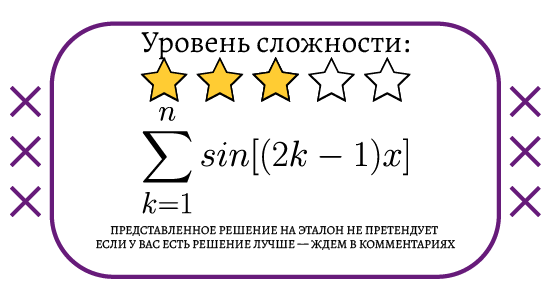 Всем добрый день! Сегодня посчитаем такую интересную сумму: Количество слагаемых здесь любое, а значит, потенциально, бесконечное. Как же посчитать такую сумму? Давайте обозначим искомую сумму некоторой переменной: Затем рассмотрим тривиальный вариант: Если синус будет равен нулю, то: Подставим в исходную сумму и заметим, что все слагаемые равны нулю: Тогда, при таких значениях x сумма очевидна: Теперь, рассмотрим остальные значения синуса. Не просто так же я откинул предыдущий вариант? Давайте умножим левую и правую части на 2 синус х: Теперь выражение под знаком суммы можно разложить на разность косинусов: Распишем нашу сумму, причем начнем с конца (так удобнее): Если внимательно присмотреться, то окажется, что все слагаемые, кроме первого и последнего приводятся: Разложим косинус двойного угла: Единицы приводятся, красота! Несложно найти ответ: Итак, окончательно наша сумма равна: Интересная и немного нетривиальная задача, как по мне! Спасибо за внимание и удачи! Если вам понравила