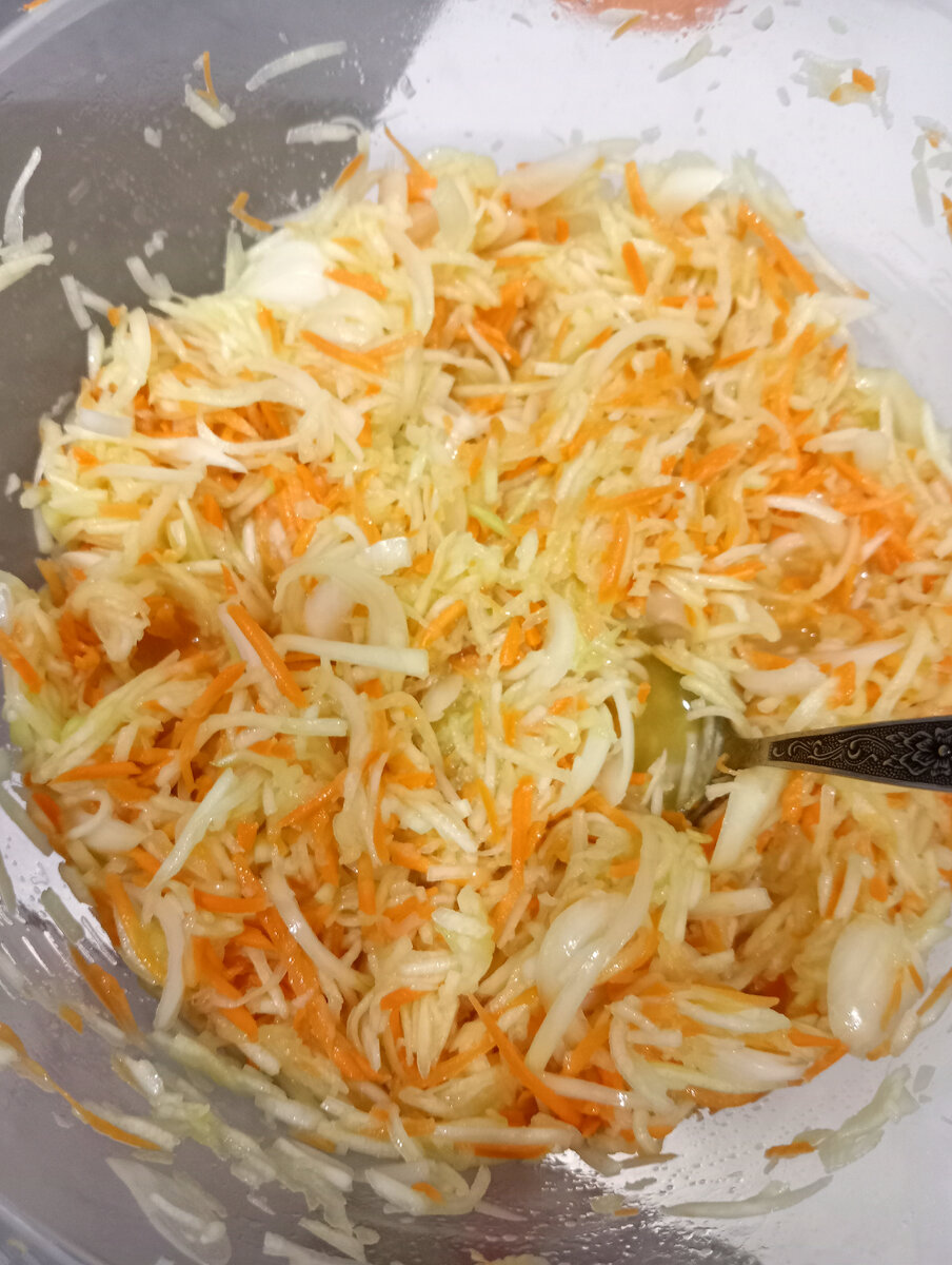 Первый раз попробовала этот салат у подруги и тоже решила сделать. На вкус очень напоминает маринованную капусту. Да и на вид тоже. Не вариться, не стерилизуется, храниться в холодильнике. Ингредиенты: • 3 кг кабачков (очищенных от кожуры и семян) •0.5 кг очищенной моркови •0.5 кг очищенного лука • головка чеснока •1 стакан сахара •1 стакан 6%уксуса •1 стакан растительного масла •3 столовые ложки соли Кабачки и морковь натереть на крупной тёрке , можно на тёрке для корейской моркови . Лук нарезать кольцами, полукольцами или перьями, по желанию . Чеснок произвольно измельчить- ножом, чеснокодавилкой или натереть на тёрке. Всё соединить, перемешать, добавить сахар, соль, уксус и растительное масло. Ещё раз хорошенько перемешать . Дать настояться 3 часа при комнатной температуре, периодически перемешивая. Разложить по стерилизованные банкам. Хранить в холодильнике. Я делала порцию на 1 кг кабачков, пересчитав пропорционально остальные ингредиенты. На выходе вот такой объем получился.