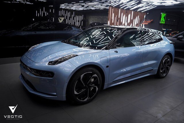 Нашими специалистами была выполнена полная оклейка виниловой пленкой Zeekr 001. Логично начать с заводского состояния автомобиля. Он приехал к нам в этом нежно-голубом оттенке. Сразу отметим, что буквально за неделю до этого мы закончили работы по точно такой же модели Zeekr,поэтому у нас все арматурные работы заняли гораздо меньше времени. Как и с предыдущим автомобилем, здесь был использован фирменный винил, но уже немного с другим рисунком. Отметим, что такая пленка выполняет лишь стайлинг авто, но не защищает ЛКП как антигравийная пленка, а все потому что их толщина не достигает даже 100 микрон. Если же нужно защитить кузов и изменить его облик, ты мы рекомендуем использовать цветной полиуретан, как на этой Porsche Panamera. Задача была выполнена буквально за 4 дня с учетом арматурных работ.