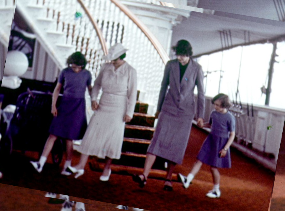 На этих кадрах юная Элизабет и Маргарет с мамой и гувернанткой Мэрион «Кроуфи» Кроуфорд танцуют матросский танец на борту королевской яхты. Принцессам 9 и 6 лет.