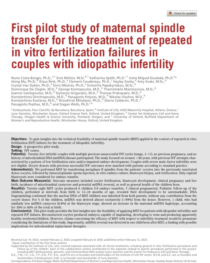 Исследование подтвердило минимальный переноса мтДНК( т. е. наследования мтДНК как донора, так и реципиента) (% 1% гетероплазмии) во всех бластоцистах из циклов MST, которые привели к родам живым плодом.