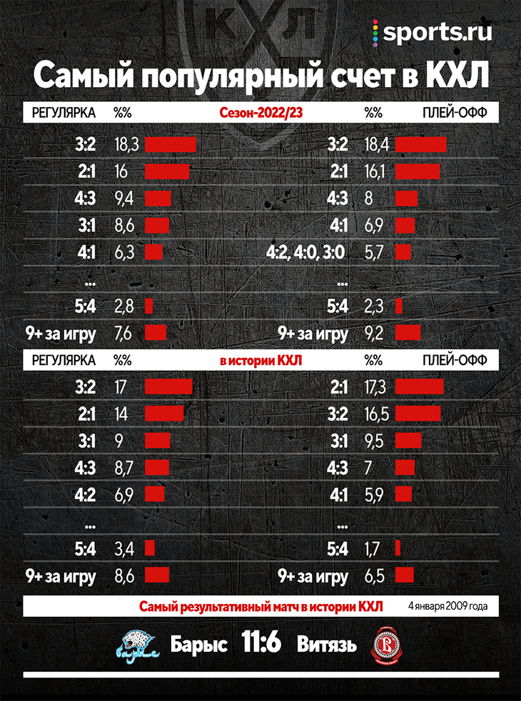 Чаще всего в регулярке и розыгрыше Кубка Гагарина случались 3:2 (137 раз) и 2:1 (120). В топе по популярности в России неожиданно выделяются – 4:3 (70 раз), 3:1 (64) и 4:1 (47).