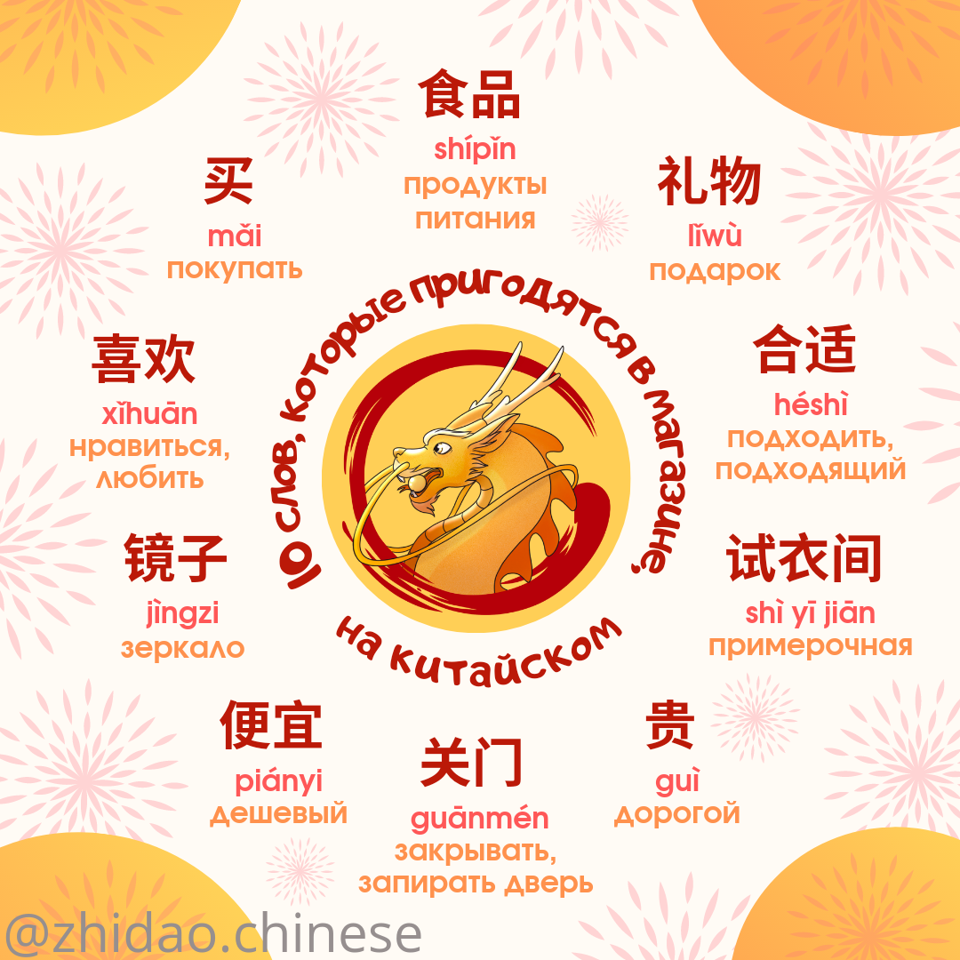 #zhidao_способы_сказать💭 Сегодня делимся словами, которые могут вам понадобиться в китайском магазине 🛍️ 1️⃣ 喜欢 xǐhuān нравиться, любить 2️⃣ 买 mǎi покупать 3️⃣ 食品 shípǐn продукты питания 4️⃣ 礼物 lǐwù подарок 5️⃣ 试衣间 shì yī jiān примерочная 6️⃣ 合适 héshì подходить, подходящий 7️⃣ 关门 guānmén закрывать, запирать дверь 8️⃣ 贵 guì дорогой 9️⃣ 便宜 piányi дешевый 🔟 镜子 jìngzi зеркало 📝 Ссылка на карточки Quizlet для изучения новых слов: ❗В Quizlet вы можете послушать произношение всех фраз! Для этого нажмите на значок микрофона 🔊 📚 Хотите, чтобы Вы или Ваш ребенок заговорили на китайском? Напишите нам для записи на групповые / индивидуальные занятия! 🎓