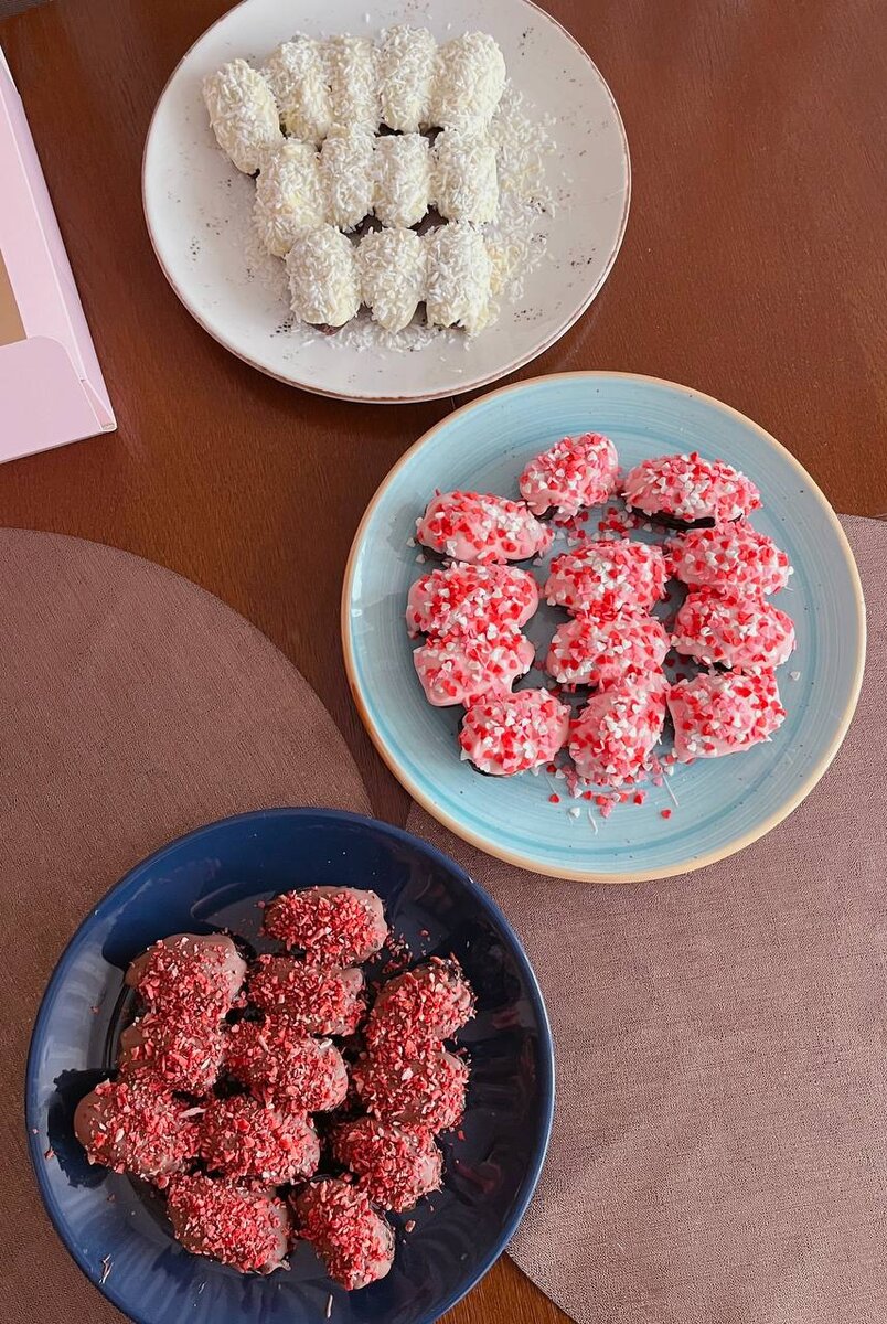 Финики в нежно-розовом шоколаде с начинкой из густых сливок и сублимированной клубники, декорированные кондитерской посыпкой в виде белых, розовых и красных сердечек🤍
