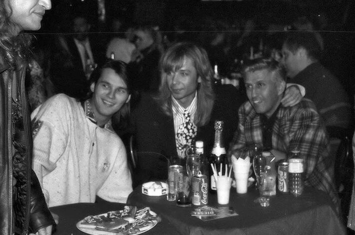 Это место собирало весь бомонд лихих 90-ых - тут и коммерсанты, и их "крыша", и новоявленные бизнесмены всех мастей в сопровождении подруг. В начале 90-х еще не существовало понятия "ночной клуб", и "Арлекино" стал первым местом, которое можно было бы так назвать. Почти каждый вечер на сцену ресторана с танцполом приезжали звездные гости и выступали перед состоятельными гостями. Кто изначально был владельцем "Арлекино"? В 1992 году друзья Саша Черкасов и Виктор Борисов взяли в аренду помещение в здании Московского киноцентра. В начале все мирно сосуществовали - решали вопросы, отдыхали, выпивали и приятно проводили время в компании танцовщиц и начинающих певиц. Но очень скоро клуб начал приносить большую прибыль, которая исчислялась сотнями тысяч в валюте. На такой прибыльный кусочек позарились чеченцы и их "соратники", Бауманская ОПГ. И началась изматывающая борьба за право владения этим бизнесом. Сергей Зверев, Влад Сташевский, Юрий Айзеншпис отдыхают в "Арлекино", Москва, 1994 год