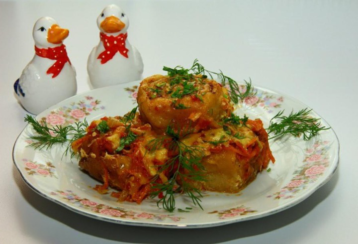 По сути, это рулетики из теста и фарша, которые либо отваривают в подсоленной воде и подают со сметанным соусом, либо запекают в томатной подливке с овощами. Почти пельмени, только процесс приготовления гораздо проще и быстрее! Понадобится: Для теста: Для фарша: Для заливки: Дополнительно: Приготовление: