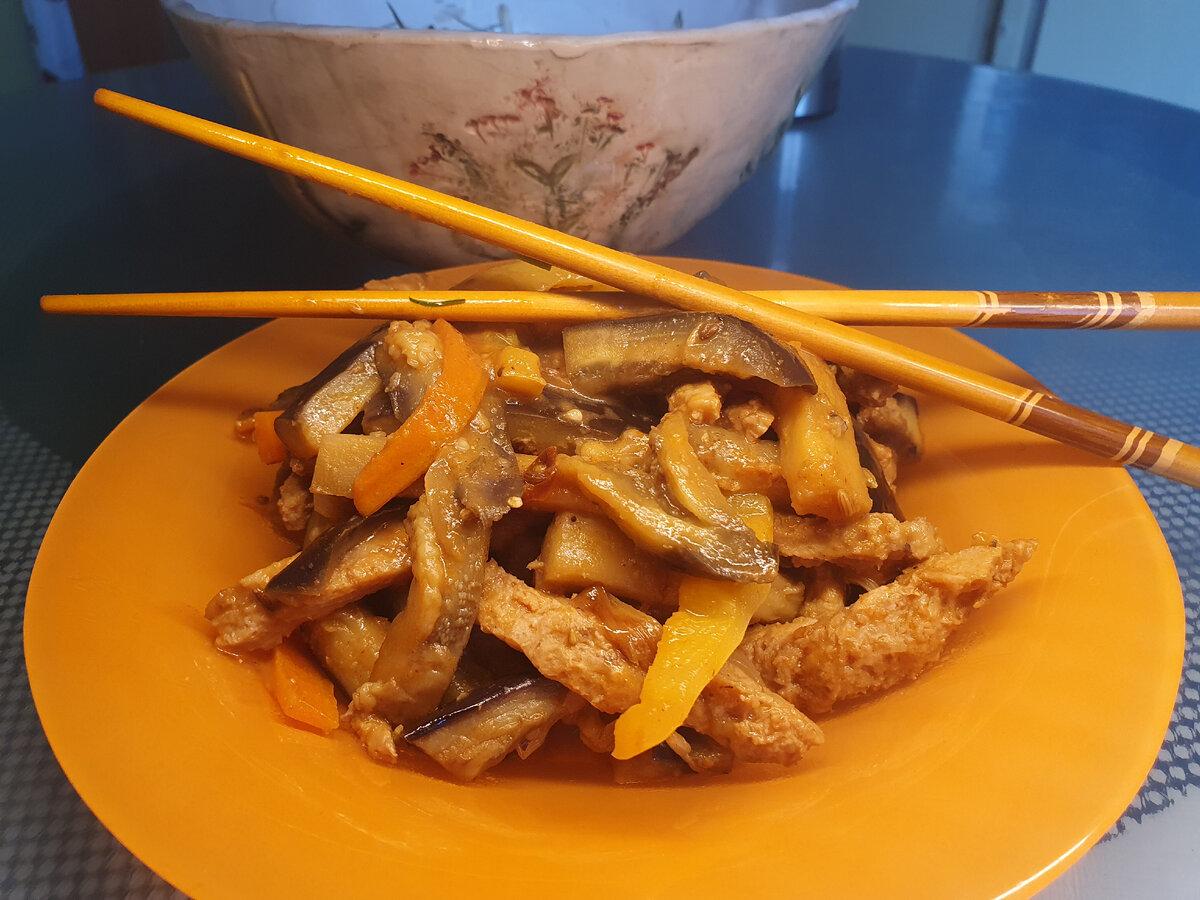 Мне всегда очень интересно пробовать новое, поэтому процесс расширения ассортимента продуктов, которые я использую на кухне, видимо, не закончится никогда. Сейчас я развлекаюсь с моим недавним приобретением – соевым мясом. Нашла без добавок – прекрасная база для экспериментов! Ингредиенты: соевое мясо сухое 75г, мясной или овощной бульон 225г, баклажаны 2шт, сладкий перец 1шт, репчатый лук 1шт, морковь 1шт, чеснок 2зуб, чили 1шт, томатная паста 1ч.л, китайская смесь специй 1ч.л Соевое мясо представлено в форме фарша или кусочков различной величины. На пробу я взяла удлинённые кусочки среднего размера как в гуляше. Мясо замочить по инструкции. Если производитель не указывает пропорции, то это как правило 1:3. Таким образом, чтобы получить около 300г готового мяса, нужно взять 75г сухого и залить 225г жидкости. Это может быть и простая вода, но в разы вкуснее заливать бульоном. В крайнем случае сделать настой из специй: специи с водой довести до кипения и полностью отсудить под
