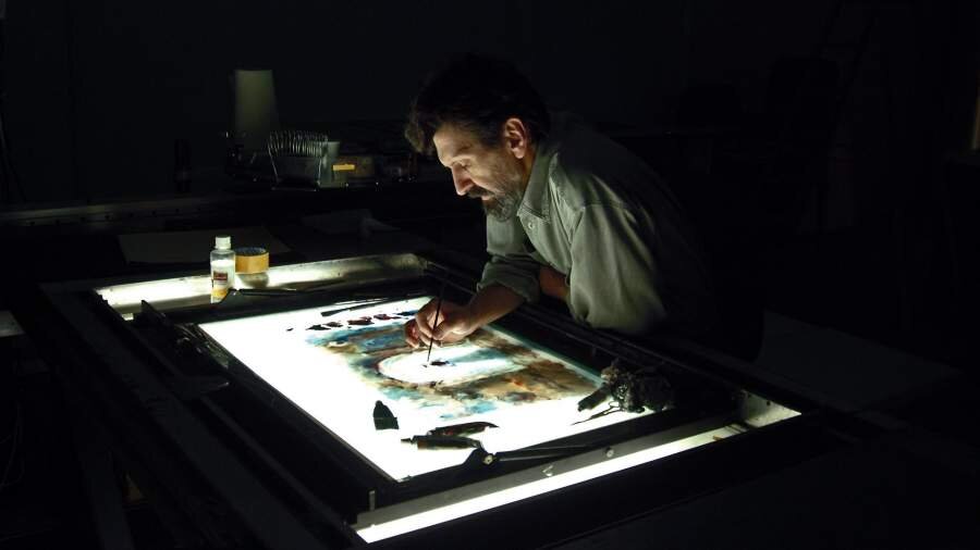 — Там представлены фильмы, эскизы, в том числе те, которые я делал еще как художник для коллег-режиссеров, наброски к будущим и несостоявшимся фильмам, а также достаточно много работ, которые я всерьез не воспринимал как материал для экспозиции, — это этюды из разных поездок, живописные работы. Они должны были лежать в архивах, в сундуках, но куратор Нина Павловна Голенкевич меня переубедила. Кроме того, мы включили в экспозицию иллюстрации, которые я делал для книг ярославского издательства. В общем, получился разножанровый эксперимент.