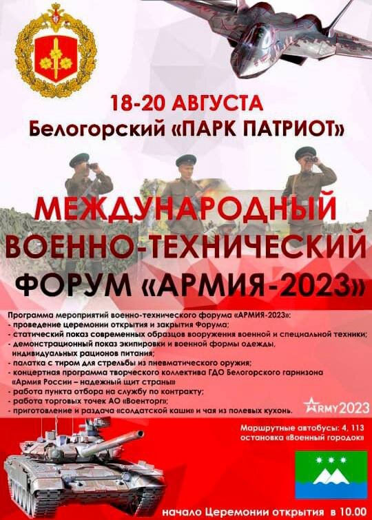 Белогорск станет участником Международного военно-технического форума «Армия-2023». Он будет проходить с 18 по 20 августа в парке «Патриот». Церемония открытия череды трехдневных мероприятий форума начнется в 10:00. Программа включает статический показ современных образцов вооружения военной и специальной техники, демонстрационный показ экипировки и военной формы одежды, индивидуальных рационов питания. Также для гостей форума творческий коллектив ГДО Белогорского гарнизона выступит с концертной программой «Армия России - надежный щит страны». Будут работать палатка с тиром для стрельбы из пневматического оружия, торговые точки «Военторг», пункт отбора на службу по контракту. Также во время форума посетителей угостят солдатской кашей и чаем из полевых кухонь. Каждый желающий сможет познакомиться с историей и предметами обихода военных лет в «Партизанской деревне». Это реконструкция поселения партизан. В избах выставлены экспозиции домашней утвари периода Великой Отечественной войны. Мн