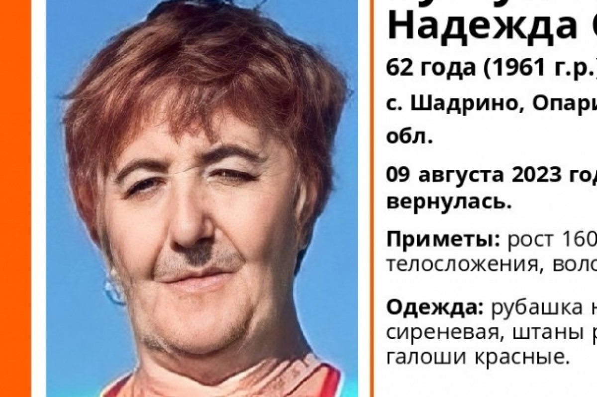 Женщина ушла в лес и пропала в Кировской области 9 августа, сообщает поисковый отряд «Лиза Алерт». О местонахождении 62-летней Надежды Бушуевой ничего неизвестно уже сутки. Волонтёры объявили о планирующемся выезде в лес на поиски пожилой женщины. Они собирают добровольцев. Также поисковый отряд просит жителей Кировской области распространить ориентировки в сети. Приметы пропавшей: рост 160 сантиметров, нормального телосложения, чёрные волосы. Была одета в светло-сиреневую рубашку на пуговицах, разноцветные штаны в цветочек, красные галоши. Если вам что-то известно о местонахождении пропавшей женщины, позвоните по номерам 8 (800) 700-54-52 или 112. Если готовы помочь с поиском, звоните по телефону 8 909 130 09 89.