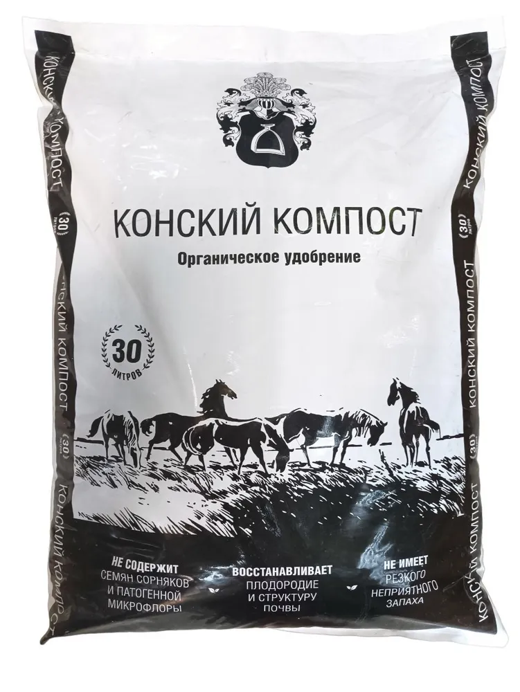 - Положите небольшое(не более 20% объема контейнера) количество конского компоста в горшок, затем добавьте почву для посадки растения