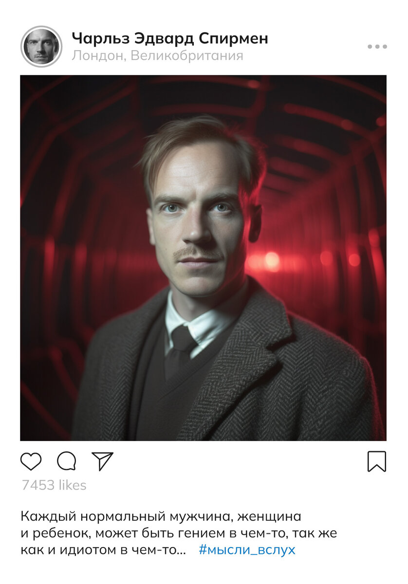 Мы попросили нейросети оживить фотографии Чарльза Спирмена, Луиса Леона Тэрстоуна, Джоя Пола Гилфорда, Реймонда Бернарда Кеттела, Джона Леонарда Хорна и Джона Биссела Кэрролла. И представили, что бы они могли написать с своих соцсетях. См. карусель выше. Невероятно, правда?