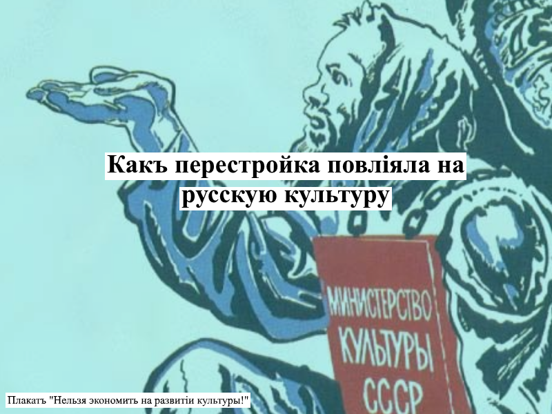 Пикъ развитія русской культуры пришелся на конецъ XIX-начало XX вѣка, когда въ Лондонѣ, Парижѣ и Берлинѣ было модно читать русскихъ авторовъ, смотрѣть русскій балетъ и слушать русскихъ композиторовъ. Пожалуй, процвѣтаніе ея продолжилось бы, если бы не череда потрясеній въ видѣ войны, революцій и установленія совѣтской власти. Если въ 1920-е годы еще сохраняется какая-то активность въ искусствѣ и литературѣ, то съ преобразованіемъ режима изъ авторитарнаго въ тоталитарный дѣятели культуры фактически уходятъ въ подполье и остаются тамъ почти вѣсь XX вѣкъ. Но ситуація мѣняется въ перестройку... Перестройка несла перемѣны во всѣхъ сферахъ жизни совѣтскаго общества, и культура не была исключеніемъ. Для этого періода характерно ослабленіе цензуры и ослабленіе давленія на дѣятелей искусства, литературы, музыки и т.п.. Политическая и экономическая ситуація оказываетъ вліяніе на то, что поютъ музыканты, что рисуютъ художники и что пишутъ писатели, здѣсь и обиды за то, что было, и ожи