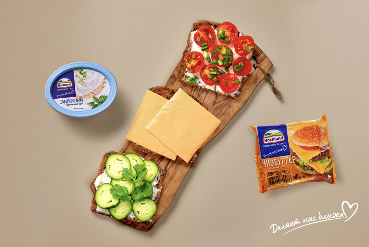 Предлагаем разнообразить наши будни и поиграть во “вкусный светофор”. Можно приготовить оригинальный трехцветный завтрак! В этом вам помогут сезонные овощи и, конечно же, разные вариации сыра Hochland, которые так гармонично сочетаются с другими продуктами благодаря своему богатому сливочному вкусу. Возьмем 3 ломтика цельнозернового хлеба, обжарим их на сухой сковороде, чтобы стали хрустящими. Два из них намажем творожным сыром Hochland «Сливочный» - это будет прекрасной основой для овощных ингредиентов, потому что этот сыр обладает нежной кремовой текстурой, которая идеально подходит для намазывания на хлеб. На один выложим мелко порезанные томаты, на второй – дольки огурца и листики петрушки. Третий хрустящий кусочек «застелим» ломтиками плавленого сыра Hochland «Чизбургер», который имеет яркий желтый цвет и насыщенный вкус. Наш светофор готов! Такой завтрак не только визуально привлекателен, но и полезен, так как включает в себя разнообразные овощи и вкусный сыр Hochland. Позаботьт