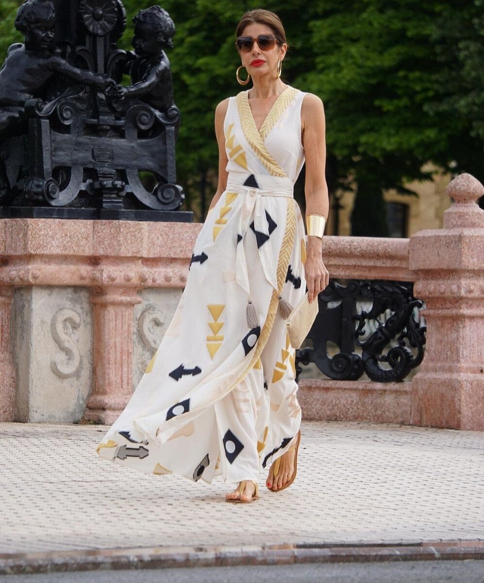 Любительницам сдержанных сетов точно понравятся следующие наряды от Пилар. Например, этот образ с белым платьем-рубашкой будет смотреться выигрышно на любой даме 50+.